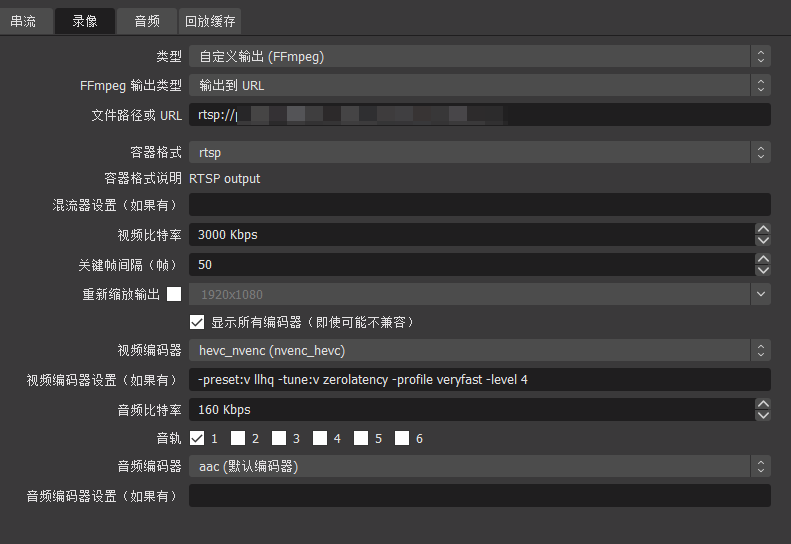 推流使用的是OBS,因为OBS的推流选项无法直接推送rtsp流,所以使用录制功能完成推流