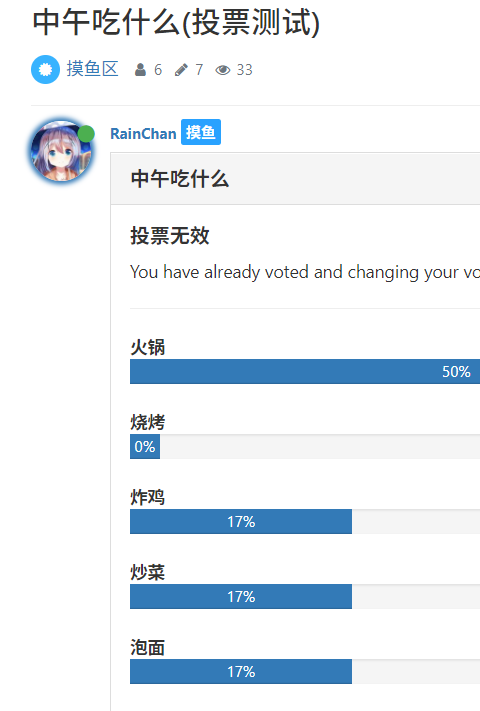 还支持投票,投票使用插件nodebb-plugin-poll解决,发起投票方式通过在发帖界面选择插入投票