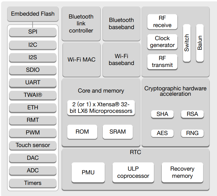 可以看到ESP32有很丰富的硬件配置,包括32位双核CPU和自带WiFi蓝牙,内置的加密算法硬件加速模块和大量IO相关功能