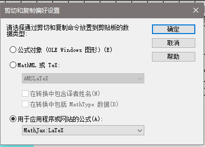 在剪贴板配置中,应该选择第三项:应用于应用程序或者是网站的公式,并在里面选择mathjax:latex,如图